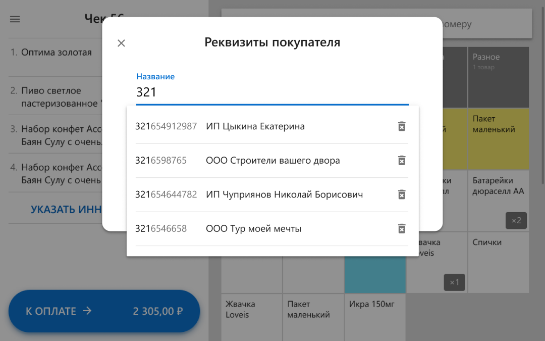 2. В следующий раз касса показывает на экране эти реквизиты, как только сотрудник начинает вводить то же название или ИНН.
