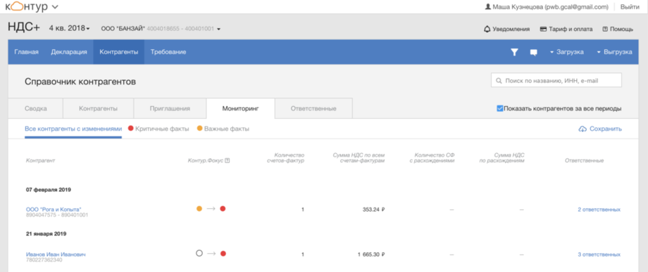 Модуль Контур.Экстерна НДС+ помогает снизить риски на всех этапах работы с НДС: проверить добросовестность контрагентов, устранить ошибки и расхождения в данных, составить декларацию, получая советы экспертов, оперативно ответить на требование налоговой о пояснениях.