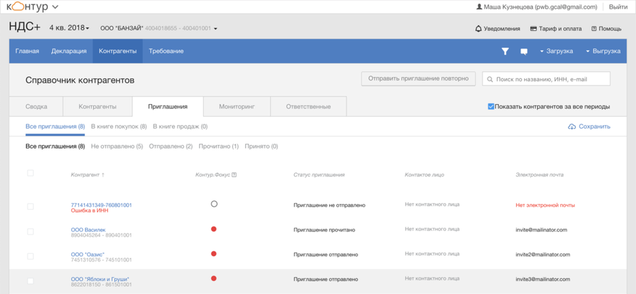 Сервис сверит счета-фактуры с теми вашими контрагентами, которые уже выгрузили данные в модуль, а остальным — вышлет приглашения. Вам нужно лишь указать их e-mail.