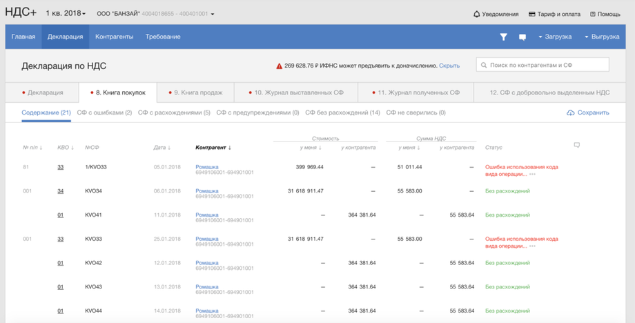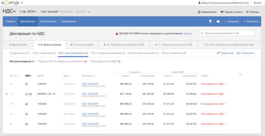 Контур.НДС+ обнаружит несоответствия в реквизитах контрагентов, расхождения по суммам, датам и номерам счетов-фактур. Сдавайте в ФНС правильные декларации и снижайте количество требований.