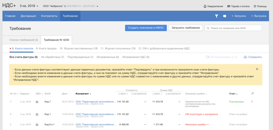 Обрабатывайте требования налоговой о представлении пояснений за несколько кликов: все сведения по сделкам и информация по расхождениям с контрагентами доступны на одном экране.